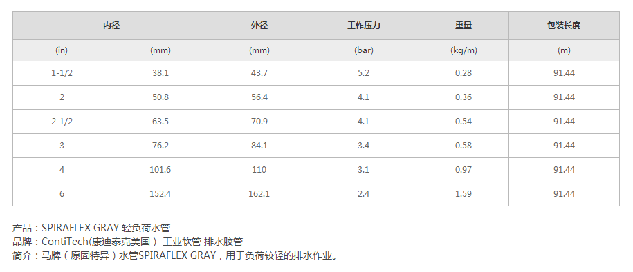 內膠:熱塑性塑料合金,聚氨酯和聚氯乙烯的合成材料,排靜電。外膠:丁腈橡膠,聚氨酯和聚氯乙烯共混而成的熱塑性塑料合成材料,可排靜電。增強層:硬質的高密度以聚氯乙烯為基膠的PLIOVIC螺旋加強層。溫度:-30℉~158℉(-34℃~70℃)顏色:黑色內徑外徑工作壓力爆破壓力彎曲半徑真空度HG包裝重量inmminmmpsiMpaps